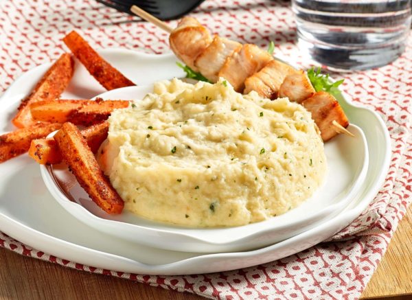 - Remettre en température la purée de panais et pommes de terre d’aucy. Mettre les blancs de poulet en brochettes, sortir les frites du four et servir le tout, chaud.