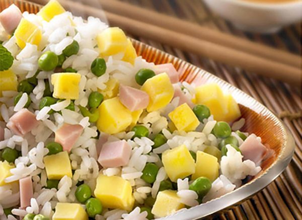- Ajouter le riz, les petits pois, les oignons, les dés de jambon et les cubes d’omelette Cocotine.